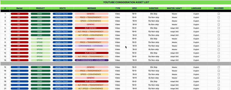 We had 49 bespoke assets to produce, (YIKES), not just with messaging changes but in different markets too. So we needed the currency (and therefore person) to change even if the script was staying the same.